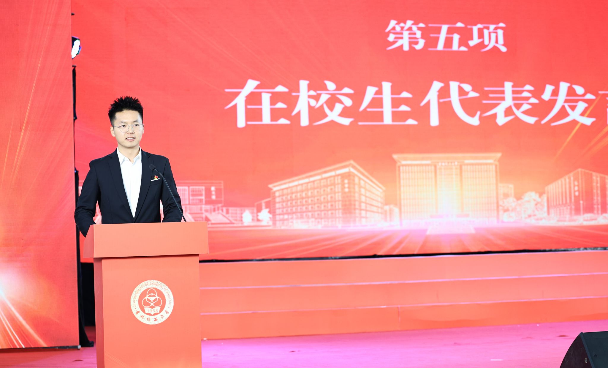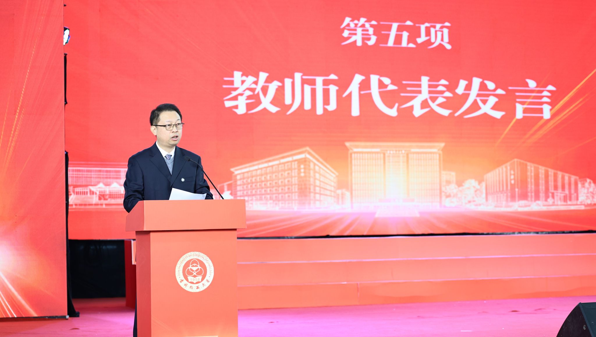 发展规划处处长闫广平、校友代表温金明教授、在校生代表李茁同学分别作为教师、校友和学生代表发言,表达了作为“化大人”的骄傲与对母校未来的美好祝福。会上播放了学校“十四五”时期高质量发展掠影视频和校友祝福视频,引发了师生的强烈共鸣。