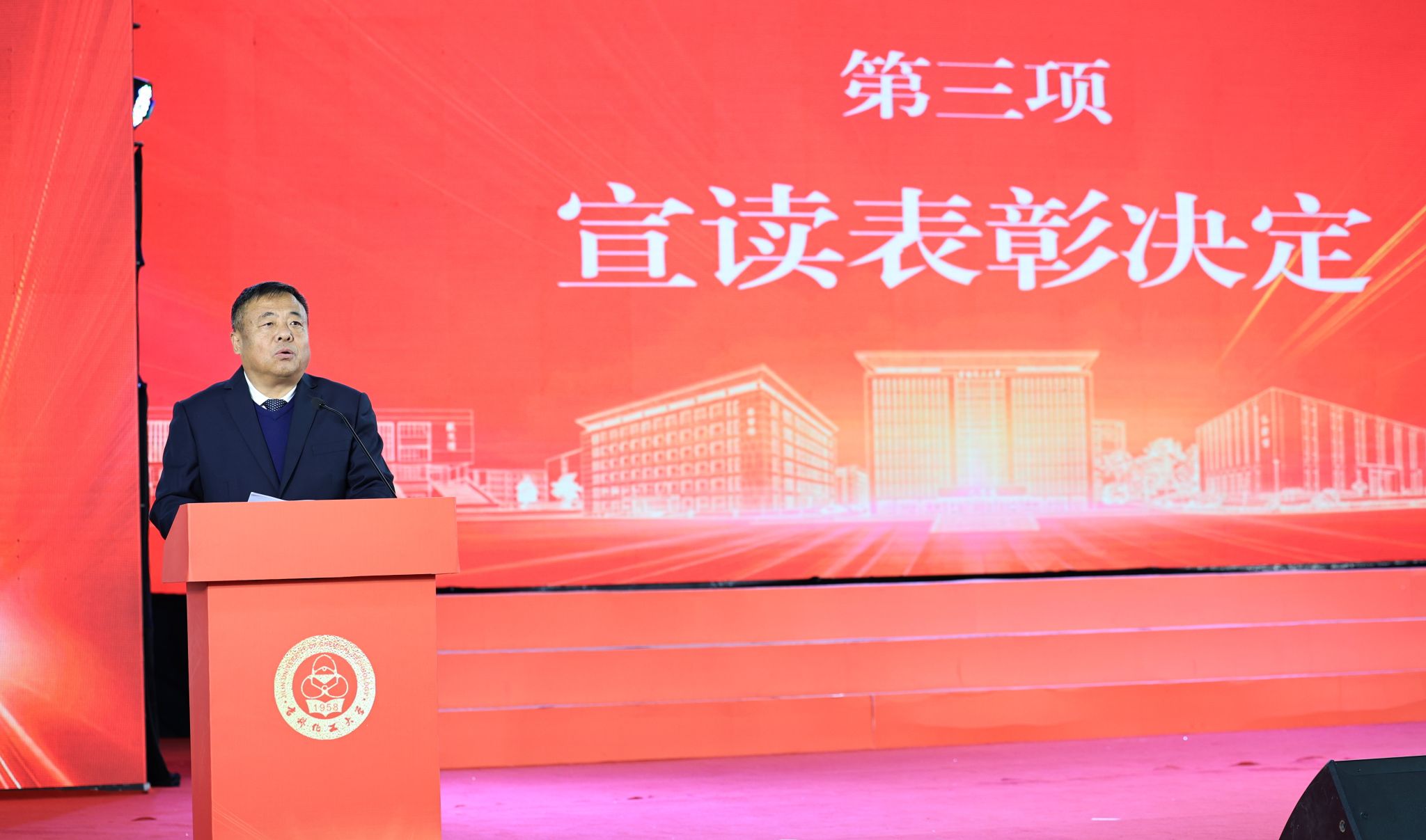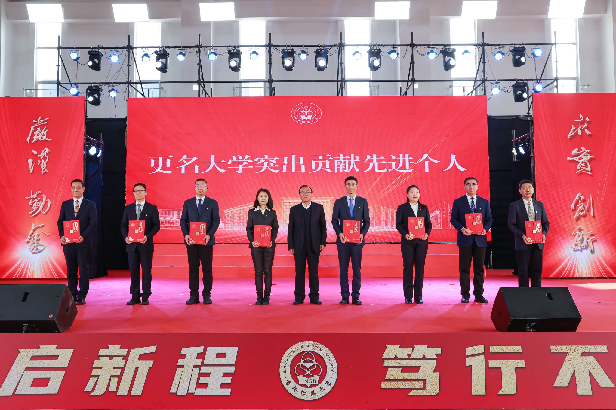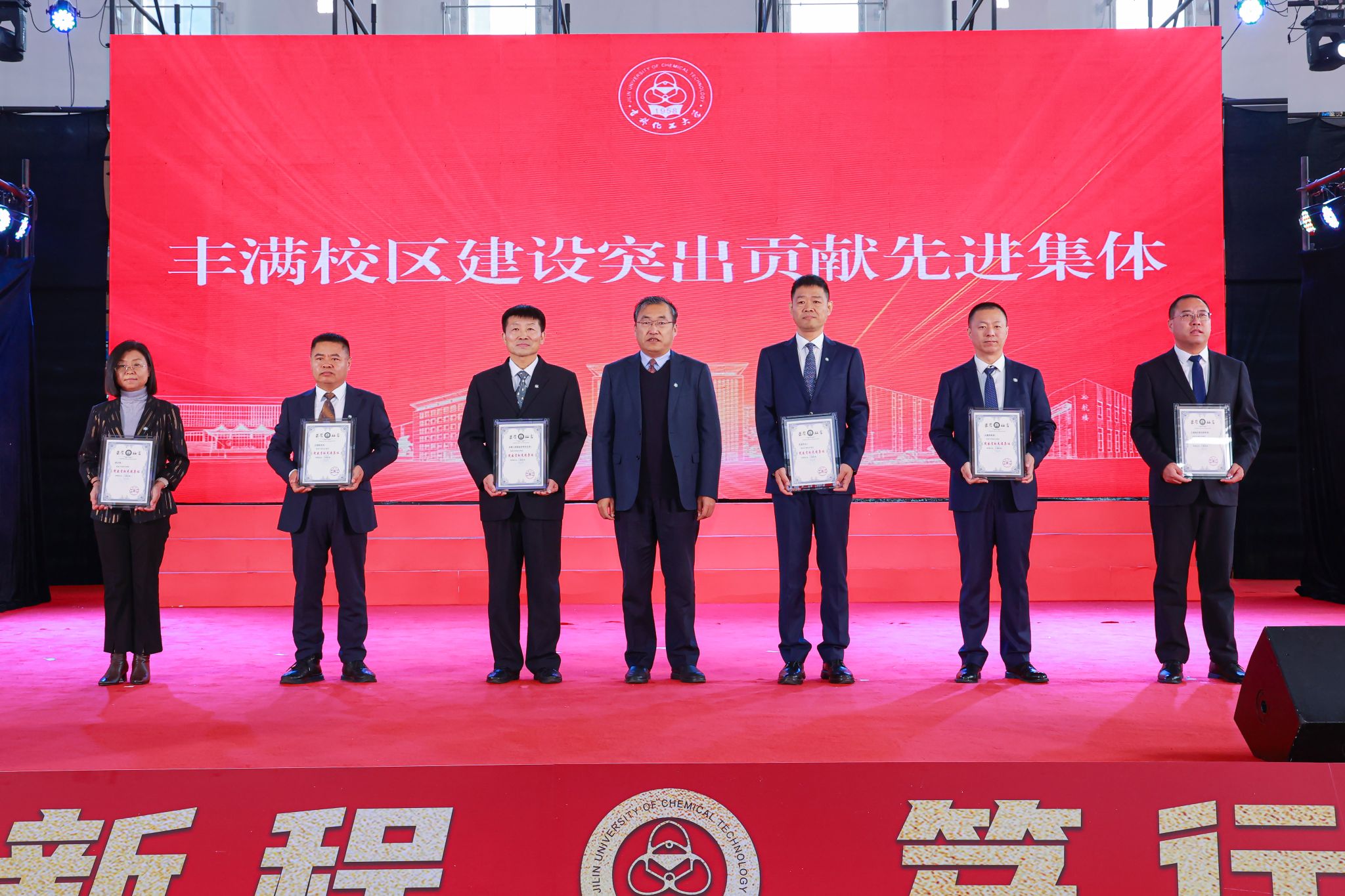 学校党委对在更名大学、丰满校区建设和推进高质量发展中表现突出的先进集体和先进个人进行了表彰。党委副书记蔡立峰宣读《关于表彰在更名大学、丰满校区建设和推进高质量发展中表现突出的先进集体和先进个人的决定》,学校领导为获奖集体和个人颁发奖牌和证书。