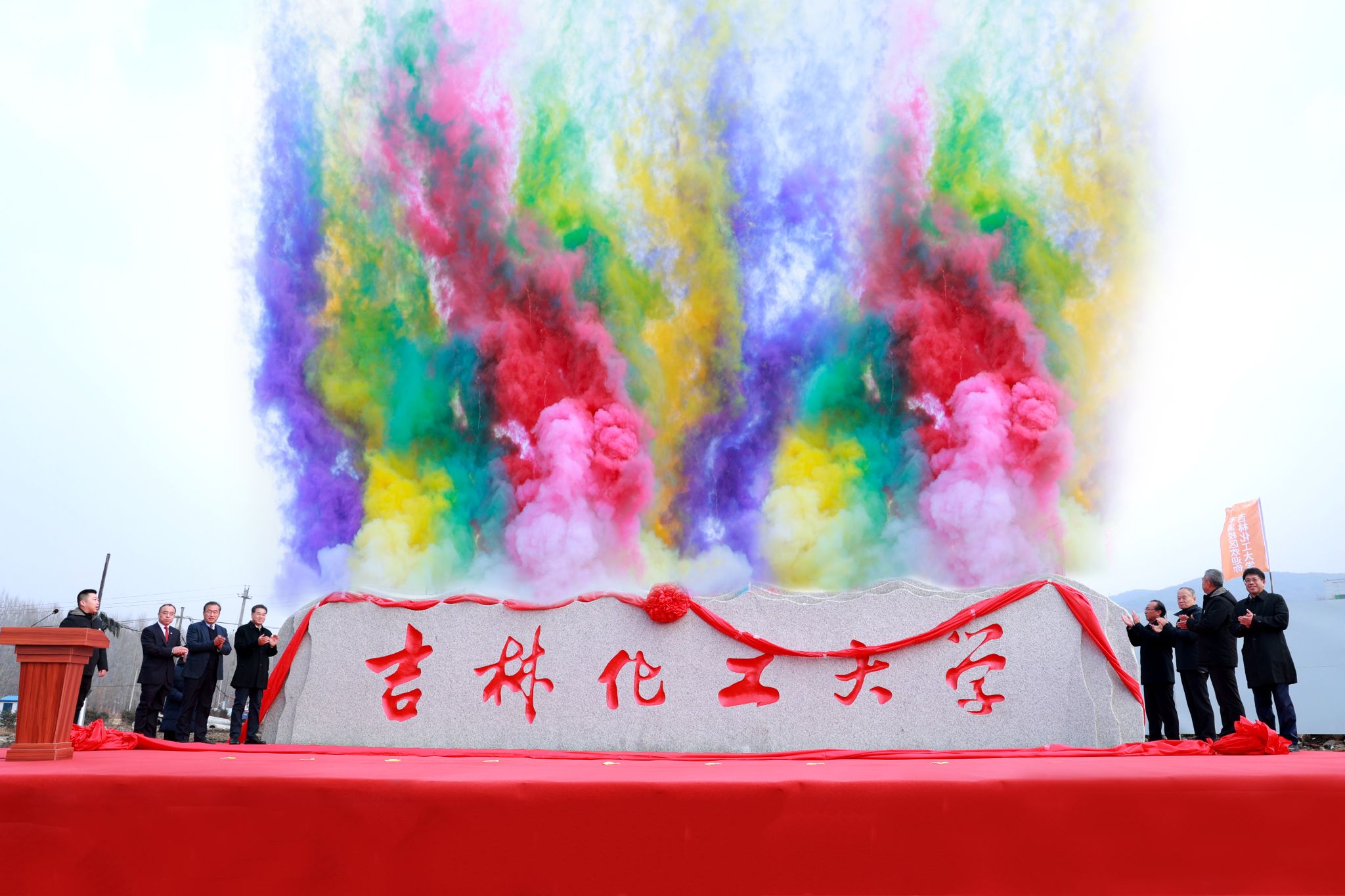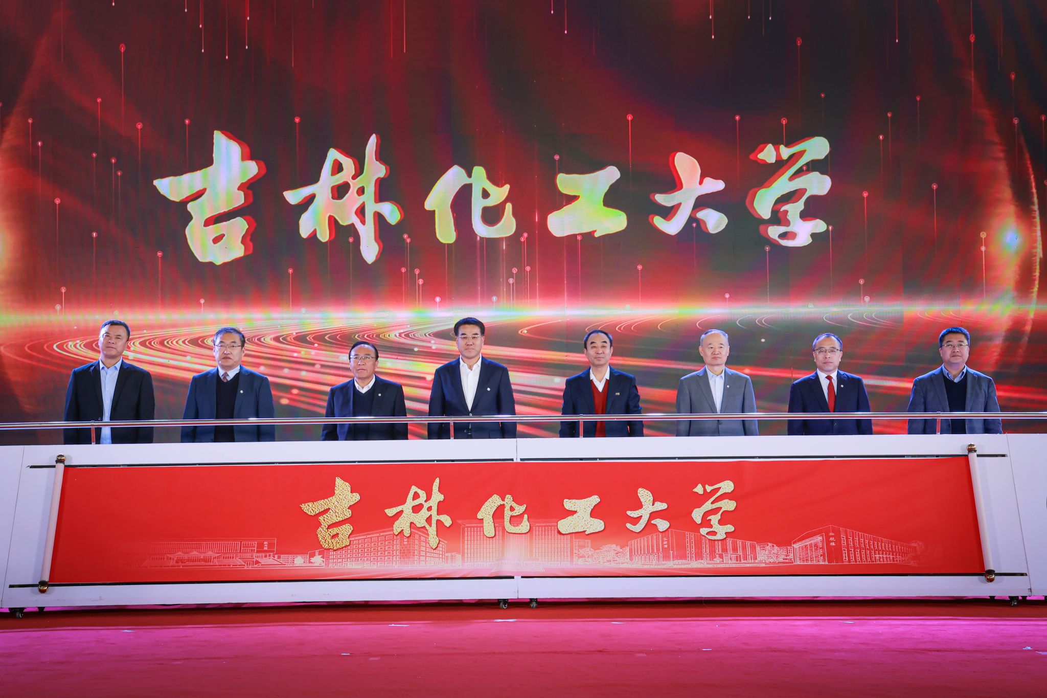 张明耀、艾学忠与胡越平、宋春辉、曲永印、庄志军,校友代表李永峰、左龙庆共同为“吉林化工大学”揭牌。在热烈的倒计时声中,崭新的校名正式亮相,现场掌声雷动,激情高昂。